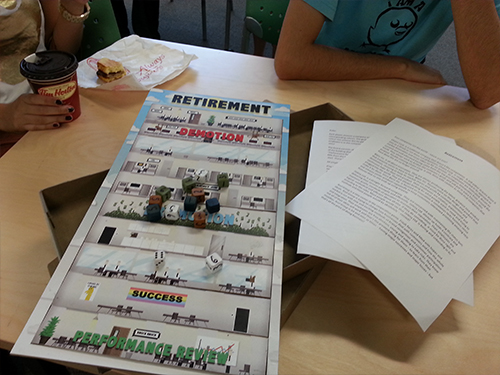The point of the game is to get your three (3) employees to retirement first. While they are employed to you they can be promoted or demoted. You want your employees to retire at the highest position possible. Just be careful your employees don’t fall off and get fired!