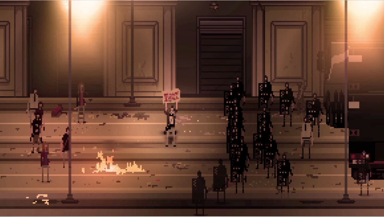 The player runs, aims, shoots, and jumps to achieve their goal of overthrowing the government. The gameplay is reminiscent of games such as Contra or Metal Slug, however, instead of being a straight run to the right, Dye incorporates the need to fight up and over buildings.