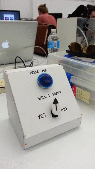 Originally, I was going to make an alarm of sorts that was to help you focus on projects and motivate you to work. Unfortunately, due to complications with the circuitry and parts it was not coming together. In desperation, I created this – the “Will I Pass? Machine”.